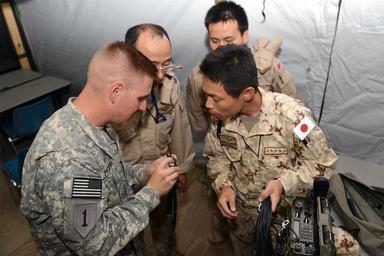 | Keywords: Combined Joint Task Force-Horn of Africa 130705-N-IZ662-450.jpg  en From left U S Army 1st Lt Christopher Hoff Japan Maritime Self-Defense Force Lt Hirosuke Watanbe Leading Seaman Daisuke Araki and Japan Ground Self-Defense Force Sgt 1st Class Yasuyuki Iwashita inspect radio equipment July 5 2013 at Camp Lemonnier Djibouti Hoff was a communications officer with the 1st Battalion 63rd Armor Regiment 2nd Armor Brigade Combat Team 1st Infantry Division The Japanese service members were assigned to the Japan Self-Defense Force Deployment Air Force for Counterpiracy Enforcement unit a Combined Joint Task Force-Horn of Africa coalition partner U S Navy photo by Mass Communication Specialist 1st Class Tom Ouellette/Released 2013-07-05 Petty Officer 1st Class Thomas Ouellette https //www dvidshub net/image/974969 130705-N-IZ662-450 2013-07-18 23 47 CAMP LEMONNIER DJ PD-USGov-Military-Navy Combined Joint Task Force - Horn of Africa Camp Lemonnier Images from DoD uploaded by Fæ People of the JMSDF People of the JGSDF |