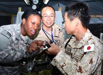 | Keywords: Combined Joint Task Force-Horn of Africa 130705-N-IZ662-491.jpg  en From left U S Army Pfc Kherrion Sweet Japan Maritime Self-Defense Force Lt Hirosuke Watanbe and Japan Ground Self-Defense Force Sgt 1st Class Yasuyuki Iwashita inspect radio equipment July 5 2013 at Camp Lemonnier Djibouti During their deployments U S and Japanese service members developed an emergency communications system and tested their radio equipment to ensure the gear was compatible Sweet was a signals systems operator with the 1st Battalion 63rd Armor Regiment 2nd Armor Brigade Combat Team 1st Infantry Division Watanbe and Iwashita were assigned to the Japan Self-Defense Force Deployment Air Force for Counterpiracy Enforcement unit a Combined Joint Task Force-Horn of Africa coalition partner U S Navy photo by Mass Communication Specialist 1st Class Tom Ouellette/Released 2013-07-05 Petty Officer 1st Class Thomas Ouellette https //www dvidshub net/image/974970 130705-N-IZ662-491 2013-07-18 23 47 CAMP LEMONNIER DJ PD-USGov-Military-Navy Combined Joint Task Force - Horn of Africa Camp Lemonnier Images from DoD uploaded by Fæ People of the JMSDF People of the JGSDF |