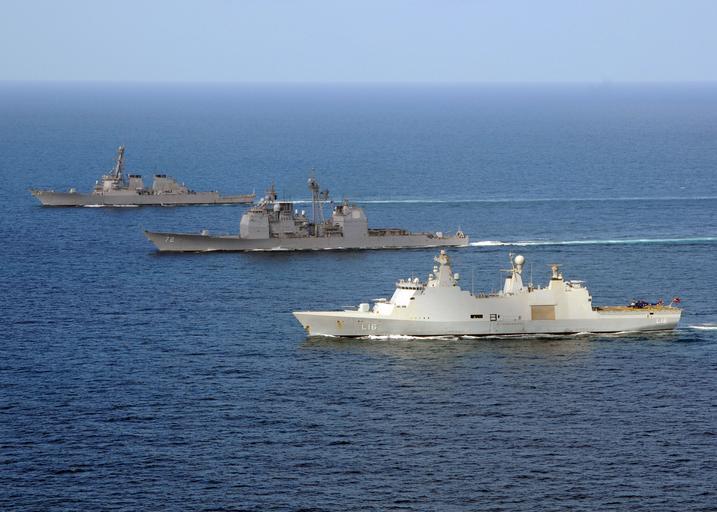 Keywords: Combined Task Force 151 - 090220-N-1082Z-215.jpg 090220-N-1082Z-215 GULF OF ADEN Feb 20 2009 The Danish flexible support ship HDMS Absalon L 16 right the guided-missile cruiser USS Vella Gulf CG-72 and the guided-missile destroyer USS Mahan DDG -72 transit the Gulf of Aden Vella Gulf is the flagship for Combined Task Force 151 a multinational task force conducting counter-piracy operations to detect and deter piracy in and around the Gulf of Aden Arabian Gulf Indian Ocean and Red Sea U S Navy photo by Mass Communications Specialist 2nd Class Jason R Zalasky/Released http //www news navy mil/view_single asp id 69015 2009-02-20 Mass Communications Specialist 2nd Class Jason R Zalasky USN U S Navy photo PD-USGov-Military-Navy Combined Task Force 151 Military in the Horn of Africa Piracy in Somalia General views of USS Vella Gulf CG-72 Naval ships in motion Ships facing left L16 Absalon ship 2004 USS Mahan DDG-72