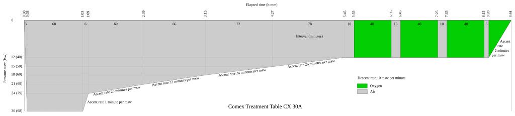 Keywords: Comex CX 30 A table.svg en Graphic representation of the Comex 30 A Recompression treatment table 2016-04-03 own Peter Southwood other versions cc-zero Decompression tables