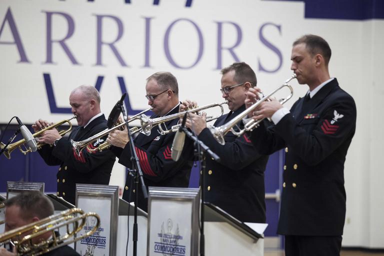 | Keywords: navy navy band navyband commodores tour 2015 musician people performer 151102-N-HA868-048 WAUNAKEE, WISC. (November 02, 2015) From left to right, Musicians1st Class Tim Stanley, Nick Cooper, Thomas Eby and Jonathan Barnes, the Commodores jazz ensemble's trumpet section, perform on a concert at Waunakee High School Field House in Waunakee, Wisc. The Commodores are currently on an 18-day concert tour of Maryland, Pennsylvania, Ohio, Indiana, Illinois, Wisconsin, and Iowa. (U.S. Navy Photo by Master Chief Musician Aaron Porter/Released) 151102-N-HA868-048 WAUNAKEE, WISC. (November 02, 2015) From left to right, Musicians1st Class Tim Stanley, Nick Cooper, Thomas Eby and Jonathan Barnes, the Commodores jazz ensemble's trumpet section, perform on a concert at Waunakee High School Field House in Waunakee, Wisc. The Commodores are currently on an 18-day concert tour of Maryland, Pennsylvania, Ohio, Indiana, Illinois, Wisconsin, and Iowa. (U.S. Navy Photo by Master Chief Musician Aaron Porter/Released) |
