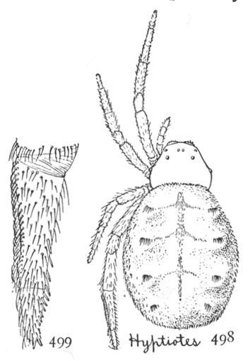 | Keywords: Common Spiders U.S. 498-9 Hyptiotes cavatus.png en Hyptiotes cavatus ”498 female enlarged eight times 499 end of hind leg showing calamistrum 1902 The Common Spiders of the United States Ginn Company Boston 1902 James Henry Emerton 1847 “ 1931 other versions PD-old-70-1923 The Common Spiders of the United States Uploaded with UploadWizard Hyptiotes cavatus |