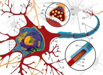 Keywords: Complete neuron cell diagram numbered.svg Complete neuron cell diagram Neurons also known as neurones and nerve cells are electrically excitable cells in the nervous system that process and transmit information In vertebrate animals neurons are the core components of the brain spinal cord and peripheral nerves it Diagramma completo di una cellula neuronale <table><tr> <br>1 Reticolo endoplasmatico rugoso corpo di Nissl <br>2 Poliribosomi <br>3 Ribosomi <br>4 Apparato Golgi <br>5 Nucleo <br>6 Nucleolo <br>7 Membrana <br>8 Microtubuli <br>9 Mitocondrio <br>10 Reticolo endoplasmatico liscio <br>11 Cono di emergenza assone <br>12 Nucleo cellula di Schwann <br>13 Sinapsi assone somatico <br>14 Sinapsi assone dendritico <br>15 Dendriti <br>16 Assone <br>17 Neurotrasmettitore <br>18 Recettore <br>19 Sinapsi <br>20 Microfilamenti <br>21 Guaina mielinica cellula di Schwann <br>22 Nodo di Ranvier <br>23 Terminale assonale <br>24 Vescicole assonali <br>25 Sinapsi assone assone <br>26 Distanza sinaptica </tr></table> Own work Image renamed from Image Complete neuron diagram numbered svg 2007-07-12 LadyofHats LadyofHats Complete neuron cell diagram without text svg Other versions/Complete neuron cell diagram Neurobiology Diagrams labelled with numbers only Neurons Histological schematic Anatomical plates and drawings of the human nervous system