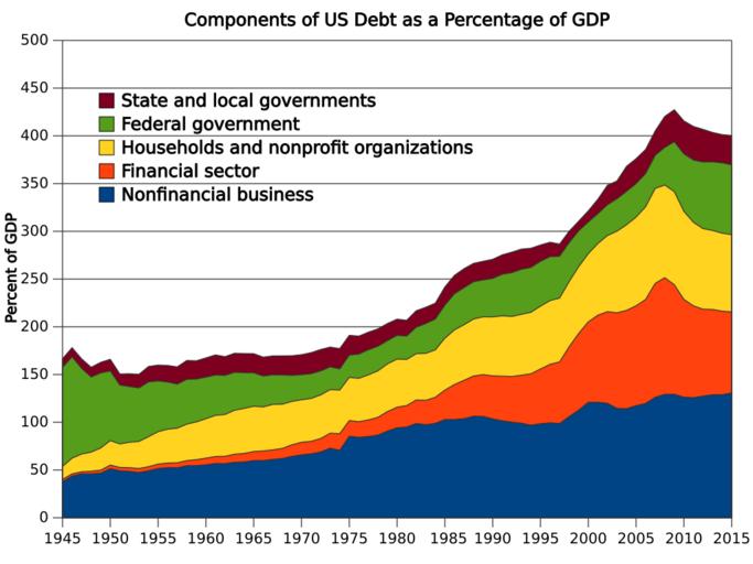 | Keywords: Components of total US debt.svg translate yes en Chart of the components of United States public and private debt since 1945 as a fraction of GDP Date from https //www federalreserve gov/datadownload/Download aspx rel Z1 series 654245a7abac051cc4a9060c911e1fa4 filetype csv label include layout seriescolumn from 01/01/1945 to 12/31/2010 FRB Z1 2016-04-03 own Delphi234 other versions cc-zero Economy of the United States Debt in the United States Debt-to-GDP ratio of the United States Economic crisis from 2007 Financial position of the United States |
