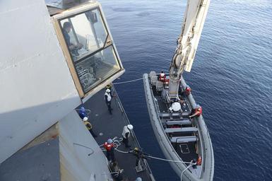 Keywords: Composite Training Unit Exercise (COMPTUEX) 131205-N-BD629-062.jpg en Sailors assigned to the amphibious transport dock ship USS Mesa Verde LPD 19 prepare to launch a rigid-hull inflatable boat RHIB in preparation for a visit board search and seizure VBSS team training exercise Mesa Verde Sailors and 22nd Marine Expeditionary Unit 22nd MEU Marines are participating in a composite training unit exercise in preparation for deployment U S Navy photo by Mass Communication Specialist 3rd Class Shannon M Smith/Released 2013-12-05 Petty Officer 3rd Class Shannon Smith https //www dvidshub net/image/1068771 131205-N-BD629-062 2013-12-09 19 33 ATLANTIC OCEAN PD-USGov-Military-Navy 22nd Marine Expeditionary Unit USS Mesa Verde LPD-19 Images from DoD uploaded by Fæ |