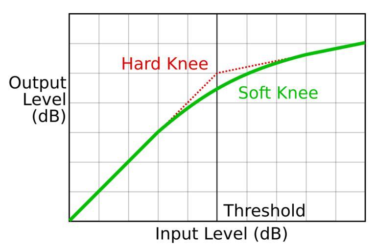 Keywords: Compression knee.svg Graph showing the Difference between a hard-knee and a soft-knee in a compressor Own 2007-09-06 Iainf Compressor audio signal processor Audio