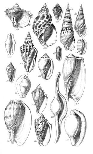 | Keywords: Conchological Manual Plate 20.png Plate Fig 426 to 443 Names see below are as used in the 1842 text gutenberg A Conchological Manual 43417 1842 George Brettingham Sowerby II 1812 “1884 PD-art-100 <table> <tr><td style font-size 80 > FIG </td> <tr><td style line-height 150 ; text-align center; colspan 2 ><i>Fam </i> Purpurifera </td></tr> <tr><td> 426 </td> <td> Eburna Zeylanica </td></tr> <tr><td> 427 </td> <td> Bullia vittata </td></tr> <tr><td> 428 </td> <td> Terebra maculata Subula Bl </td></tr> <tr><td> 429 </td> <td> Trichotropis bicarinata </td></tr> <tr><td style line-height 150 ; text-align center; colspan 2 > <i>Fam </i> Columellata </td></tr> <tr><td> 430 </td> <td> Columbella mercatoria </td></tr> <tr><td> 431 </td> <td> Mitra plicaria; <i>c</i> termination of the columella </td></tr> <tr><td> 432 </td> <td> Conohelix marmorata </td></tr> <tr><td> 433 </td> <td> Voluta Vespertilio Cymbiola Sw </td></tr> <tr><td> 434 </td> <td> Cymba porcina </td></tr> <tr><td> 435 </td> <td> Melo Æthiopicus </td></tr> <tr><td> 436 </td> <td> Volutilithes spinosus </td></tr> <tr><td> 437 </td> <td> Marginella Glabella Glabella Sw Cucumis Klein </td></tr> <tr><td> 438 </td> <td> persicula Volutella Sw Persicula Schum </td></tr> <tr><td> 439 </td> <td> Volvaria concinna </td></tr> <tr><td style line-height 150 ; text-align center; colspan 2 > <i>Fam </i> Convolutæ </td></tr> <tr><td> 440 </td> <td> Ovulum Ovum </td></tr> <tr><td> 441 </td> <td> verrucosum Calpurnus Montf </td></tr> <tr><td> 442 </td> <td> Volva Radius Montf </td></tr> <tr><td> 443 </td> <td> gibbosum Ultimus Montf </td></tr> </table> A conchological manual 1842 Bullia vittata Trichotropis bicarinata Columbella mercatoria Cymbiola vespertilio Marginella glabella |