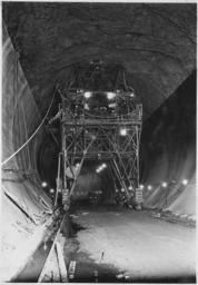 | Keywords: Concrete gun carriage used in placing 110 degree top-arch concrete in diversion tunnels - NARA - 293689.tif  Scope and content Photograph from Volume Two of a series of photo albums documenting the construction of Hoover Dam Boulder City Nevada Full caption of the photographs reads Concrete gun carriage used in placing 110 degree top-arch concrete in diversion tunnels Concrete is hauled by truck in dump-buckets into position under carriage hoisted to upper deck by bridge crane operating overhead dumped into hoppers and compelled into forms by compressed air through two 8-inch steel and rubber pipes Two gun units are operated one from either side of deck The entire assembly consists of three major units the concrete gun carriage seen in the photograph a traveler carriage used to support the compressed air pipes between the gun carriage and the form and the form carriage itself All three units operate over rails placed on tunnel alignment The form carriage is given flexibility for curve construction through a system of gores and wedges See also following photographs General notes 293689 Local identifier Department of the Interior Bureau of Reclamation Engineering and Research Center 05/18/1981 - 03/04/1988 NARA's Rocky Mountain Region Denver NRGA Building 48 Denver Federal Center West 6th Avenue and Kipling Street Denver CO 80225-0307 1932-06-30 Record group Record Group 115 Records of the Bureau of Reclamation 1889 - 2008 Record group ARC 444 Photograph albums compiled 1903 - 1972 Series ARC 293611 File unit File unit ARC Variant control numbers NAIL Control Number NRG-115-CONSTPHO85006-BC21304 yes Other versions <gallery> File Concrete_gun_carriage_used_in_placing_110_degree_top-arch_concrete_in_diversion_tunnels_-_NARA_-_293689 tif tif File Concrete_gun_carriage_used_in_placing_110_degree_top-arch_concrete_in_diversion_tunnels_-_NARA_-_293689 jpg jpg </gallery> NARA-cooperation PD-USGov NARA TIF images with categorized JPGs |