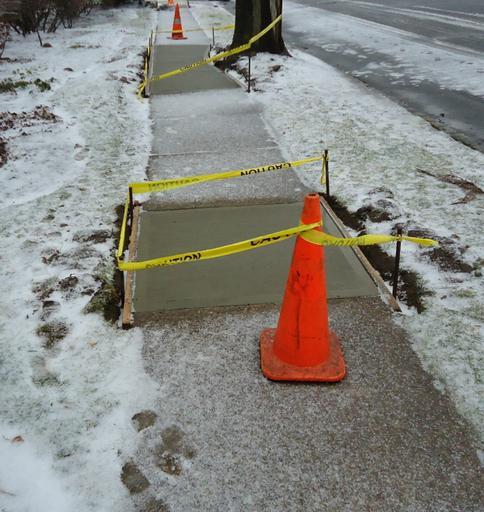 Keywords: Concrete slabs still warm after setting on a sidewalk in New Jersey.jpg en When concrete is freshly poured and while it sets over the next few days it remains warm After a light snowfall and freezing temperatures the concrete for these freshly poured slabs is so warm that snow can not form on it 2013-01-17 09 13 54 own Tomwsulcer cc-zero Uploaded with UploadWizard Sidewalks in the United States Traffic cones in the United States Concrete |