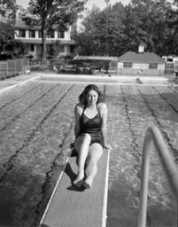 Keywords: tarboro (n.c) tarboronc swimming pools swimmingpools carolyn perrest carolynperrest blackandwhite monochrome outdoor road black and white Carolyn Perrest [?] Tarboro, NC, Champ Swimmer, thought to be at a local Tarboro swimming pool, May 1939. Taken by Baker, NC Conservation and Development Department, Travel and Tourism photo files, State Archives of North Carolina, Raleigh, NC. We need your help! Is this swimming pool the famous Tarboro "Cool Pool"? From the NCPedia ncpedia.org/cool-pool: On 9 July 1933 the Tarboro Town Council voted to ask Frick and Company of Waynesboro, Pa., to design and install a refrigerating unit for its new municipal swimming pool. After operating for only three months, the olympic-design pool, containing 300,000 gallons of water and with a constant flow of 400 gallons per minute, had become uncomfortably warm from the summer's record heat and the activity of swimmers. By mid-August Frick had installed the refrigerating device at a cost of $2,592, making the Tarboro pool what is believed to have been the first and perhaps only refrigerated outdoor pool in the country. Tarboro's "cool pool" drew crowds of swimmers and swimming meets throughout the 1930s. Carolyn Perrest [?] Tarboro, NC, Champ Swimmer, thought to be at a local Tarboro swimming pool, May 1939. Taken by Baker, NC Conservation and Development Department, Travel and Tourism photo files, State Archives of North Carolina, Raleigh, NC. We need your help! Is this swimming pool the famous Tarboro "Cool Pool"? From the NCPedia ncpedia.org/cool-pool: On 9 July 1933 the Tarboro Town Council voted to ask Frick and Company of Waynesboro, Pa., to design and install a refrigerating unit for its new municipal swimming pool. After operating for only three months, the olympic-design pool, containing 300,000 gallons of water and with a constant flow of 400 gallons per minute, had become uncomfortably warm from the summer's record heat and the activity of swimmers. By mid-August Frick had installed the refrigerating device at a cost of $2,592, making the Tarboro pool what is believed to have been the first and perhaps only refrigerated outdoor pool in the country. Tarboro's "cool pool" drew crowds of swimmers and swimming meets throughout the 1930s. |