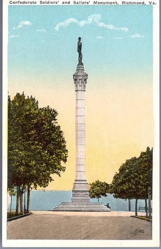 | Keywords: vcu libraries vculibraries vcu digital collections vcudigitalcollections photo border outdoor architecture Description: Confederate Soldiers and Sailors' Monument, Richmond, Va. It was unveiled May 30, 1894, at a reunion of Confederate Veterans. This imposing monument is situated in Libby Hill Park, and is one of the landmarks of the city. The bronze figure of a Confederate Soldier surrounding the top of the monument is said to be the largest piece of solid bronze ever cast in the United States. Manufacturer: Chessler Co., Baltimore, Md. Date Postmarked: Not postmarked. Rights: This item is in the public domain. Acknowledgement of the Virginia Commonwealth University Libraries as a source is requested. Reference URL: dig.library.vcu.edu/u?/postcard,574 Collection: Rarely Seen Richmond: Early twentieth century Richmond as seen through vintage postcards Description: Confederate Soldiers and Sailors' Monument, Richmond, Va. It was unveiled May 30, 1894, at a reunion of Confederate Veterans. This imposing monument is situated in Libby Hill Park, and is one of the landmarks of the city. The bronze figure of a Confederate Soldier surrounding the top of the monument is said to be the largest piece of solid bronze ever cast in the United States. Manufacturer: Chessler Co., Baltimore, Md. Date Postmarked: Not postmarked. Rights: This item is in the public domain. Acknowledgement of the Virginia Commonwealth University Libraries as a source is requested. Reference URL: dig.library.vcu.edu/u?/postcard,574 Collection: Rarely Seen Richmond: Early twentieth century Richmond as seen through vintage postcards |