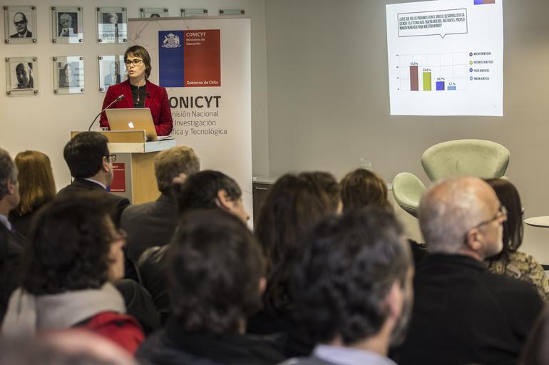 Keywords: indoor room •¿Qué entendemos por ciencia y tecnología? ¿Consideramos que nuestra educación en C y T es óptima? ¿Qué tanto prestigio tienen los científicos para los chilenos?, son algunas preguntas que responde la Encuesta Nacional de Percepción Social de la Ciencia y la Tecnología en Chile. CONICYT dará a conocer a la comunidad los resultados de la Encuesta Nacional que mide la Percepción Social de la Ciencia y la Tecnología en Chile, consulta realizada entre los meses de octubre 2015 y enero 2016, en zonas urbanas y rurales, y que busca establecer una línea base que permita conocer el estado actual en que se encuentra la relación de la sociedad con esta actividad. “Los resultados nos entregan valiosos antecedentes sobre la forma en que los chilenos entienden la ciencia y la actividad científica, por ejemplo, que la CyT nos permitirán tener una mejor calidad de vida. Esto nos obliga a compartir estos resultados con toda la comunidad, pero al mismo tiempo, comprender cómo la gente percibe estos temas nos permite mejorar nuestro aporte a la formación, desde los párvulos a la población en general; pero también traducir esa mejor comprensión y valoración de estas áreas puede impactar en los recursos que necesitamos no sólo en el ámbito formativo, sino también en el quehacer científico y tecnológico, que es imprescindible para el desarrollo económico y social del país”, explica Christian Nicolai, Director Ejecutivo de CONICYT. La encuesta presencial se aplicó a nivel nacional (en las 15 regiones del país) a 7.637 personas de 15 años y más, y se orientó bajo un marco teórico desarrollado en el documento “Consideraciones para la definición y medición de la cultura científica en Chile”, además de apreciaciones de la Red Iberoamericana de Indicadores de Ciencia y Tecnología, RICYT. Cabe destacar que, así como lo hace Chile, 11 países de la Región han aplicado este tipo de encuestas durante los últimos 15 años para conocer la percepción pública, acerca de la ciencia y la tecnología, abordando principalmente las dimensiones como: imagen sobre la CyT y de quienes las desarrollan; interés, nivel de información y hábitos cotidianos vinculados con estas temáticas; y la valoración y utilidad que éstas tienen. “Los datos que arroja esta encuesta son fundamentales para que el esfuerzo que realiza el país en Ciencia y Tecnología tenga cada día una mayor vinculación con las preocupaciones de la sociedad y una creciente incidencia en nuestro desarrollo social, cultural, y económico. Acoger estas prioridades va justamente en la línea de fortalecer las capacidades de planificación de CONICYT que nos encomendó la Presidenta de la República a comienzos de este año”, recalcó Mario Hamuy, Presidente del Consejo de CONICYT. “Estos datos otorgan un gran potencial como insumo de orientación para la toma de decisiones de las autoridades, universidades, fundaciones, empresas e investigadores comprometidos con el gran desafío que tenemos como país de incorporar el conocimiento y la inteligencia como herramientas que impulsen nuestro desarrollo”, agrega el doctor Hamuy. Del mismo modo, el Programa Explora de CONICYT concentra sus esfuerzos en ayudar a instaurar esta cultura científica en la población, a través de acciones de educación no formal en ciencias dirigidas a las nuevas generaciones desde la escolaridad temprana. ¿Cuánto de este conocimiento, actitudes y habilidades para la ciencia y tecnología han sido incorporadas por la población? “Es claro entonces que la ciencia no es de incumbencia exclusiva de los científicos, así como tampoco es un conocimiento que se crea para guardarse. La ciencia y tecnología están presentes en todos los espacios en que nos desarrollamos y, sin embargo, aún no sabemos cómo y cuánto se valora en nuestro país, cómo nos modifican y, también, cambian el rumbo de las sociedades”, explicó Christian Nicolai. Este estudio fue realizado por el Dirección de Estudios Sociales de la Pontificia Universidad Católica de Chile, DESUC. •¿Qué entendemos por ciencia y tecnología? ¿Consideramos que nuestra educación en C y T es óptima? ¿Qué tanto prestigio tienen los científicos para los chilenos?, son algunas preguntas que responde la Encuesta Nacional de Percepción Social de la Ciencia y la Tecnología en Chile. CONICYT dará a conocer a la comunidad los resultados de la Encuesta Nacional que mide la Percepción Social de la Ciencia y la Tecnología en Chile, consulta realizada entre los meses de octubre 2015 y enero 2016, en zonas urbanas y rurales, y que busca establecer una línea base que permita conocer el estado actual en que se encuentra la relación de la sociedad con esta actividad. “Los resultados nos entregan valiosos antecedentes sobre la forma en que los chilenos entienden la ciencia y la actividad científica, por ejemplo, que la CyT nos permitirán tener una mejor calidad de vida. Esto nos obliga a compartir estos resultados con toda la comunidad, pero al mismo tiempo, comprender cómo la gente percibe estos temas nos permite mejorar nuestro aporte a la formación, desde los párvulos a la población en general; pero también traducir esa mejor comprensión y valoración de estas áreas puede impactar en los recursos que necesitamos no sólo en el ámbito formativo, sino también en el quehacer científico y tecnológico, que es imprescindible para el desarrollo económico y social del país”, explica Christian Nicolai, Director Ejecutivo de CONICYT. La encuesta presencial se aplicó a nivel nacional (en las 15 regiones del país) a 7.637 personas de 15 años y más, y se orientó bajo un marco teórico desarrollado en el documento “Consideraciones para la definición y medición de la cultura científica en Chile”, además de apreciaciones de la Red Iberoamericana de Indicadores de Ciencia y Tecnología, RICYT. Cabe destacar que, así como lo h