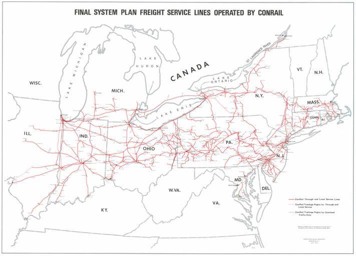 | Keywords: Conrail FSP Freight Lines Map 1975.jpg LargeImage Map of Final System Plan Freight Service Lines Operated by Conrail Plan formulated by United States Railway Association http //multimodalways org/archives/govts/federal/executive/agencies/DOT/USRAII/FSP/FSP html United States Railway Administration Final System Plan 1975-07 United States Railway Association Washington DC PD-USGov File Conrail FSP Freight Lines Map 1975 svg Conrail System maps of defunct U S railroads | ||||