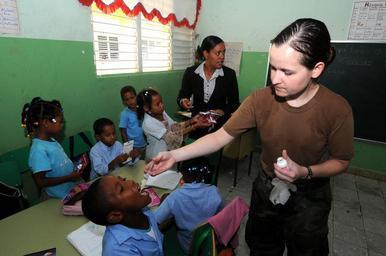 | Keywords: Continuing Promise 2008 Health Class DVIDS122498.jpg en Petty Officer 1st Class Sharon Vigue a preventive medical technician embarked aboard the amphibious assault ship USS Kearsarge gives elementary school children de-worming medicine during a preventive medicine health initiative supporting Continuing Promise 2008 Kearsarge is the primary platform for the Caribbean phase of the Continuing Promise 2008 humanitarian assistance mission an equal-partnership mission involving the United States Canada the Netherlands Brazil France Nicaragua Colombia Dominican Republic Trinidad and Tobago and Guyana 2008-10-13 Petty Officer 1st Class Emmitt Hawks Jr https //www dvidshub net/image/122498 081013-N-+++++-056 2008-10-15 20 35 SABANA GRANDE DE BOYA DO PD-USGov-Military-Navy USS Kearsarge LHD-3 Images from DoD uploaded by Fæ |
