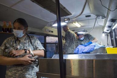 Keywords: Continuing Promise 2015 150530-N-PD309-033.jpg en Army Sgt Janina Alaniz a native of North Bergen N J and a veterinary technician assigned to Public Health Command District Fort Hood Texas prepares a cat for surgery at a mobile veterinary clinic established during Continuing Promise 2015 Continuing Promise is a U S Southern Command-sponsored and U S Naval Forces Southern Command/U S 4th Fleet-conducted deployment to conduct civil-military operations including humanitarian-civil assistance subject matter expert exchanges medical dental veterinary and engineering support and disaster response to partner nations and to show U S support and commitment to Central and South America and the Caribbean U S Navy photo by Mass Communication Specialist Seaman Deven Leigh Ellis/Released <br>Unit U S Naval Forces Southern Command U S Fourth Fleet 2015-05-30 Petty Officer 3rd Class Deven Ellis https //www dvidshub net/image/1967491/continuing-promise-2015 150530-N-PD309-033 2015-06-01 08 45 COLON PA PD-USGov-Military-Navy Fort Hood Texas Images from DoD uploaded by Fæ |