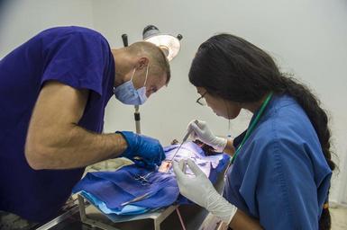 Keywords: Continuing Promise 2015 150820-N-YM856-110.jpg en 150820-N-YM856-110 SANTO DOMINGO Dominican Republic Aug 20 2015 Army Maj Jeremiah Nelson a veterinarian assigned to 85th Civil Affairs Brigade Fort Hood Texas and a Dominican veterinary technician perform surgery on a dog at a veterinary site established at Hospital Clinico Veterinario during Continuing Promise 2015 Continuing Promise is a U S Southern Command-sponsored and U S Naval Forces Southern Command/U S 4th Fleet-conducted deployment to conduct civil-military operations including humanitarian-civil assistance subject matter expert exchanges medical dental veterinary and engineering support and disaster response to partner nations and to show U S support and commitment to Central and South America and the Caribbean U S Navy photo by Mass Communication Specialist 2nd Class Brittney Cannady/Released <br>Unit Expeditionary Combat Camera 2015-08-20 Petty Officer 2nd Class Brittney Cannady https //www dvidshub net/image/2137130/continuing-promise-2015 150820-N-YM856-110 2015-08-22 17 02 SANTO DOMINGO DO PD-USGov-Military-Navy Fort Hood Texas Images from DoD uploaded by Fæ United States Navy images from Santo Domingo Continuing Promise 2015 Santo Domingo Dominican Republic |