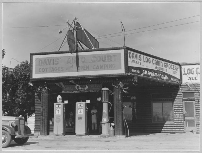 Keywords: Contra Costa County, California. Part of the Davis Auto Camp. The gas station, grocery store, "Log C . . . - NARA - 521801.jpg Scope and content Full caption reads as follows Contra Costa County California Part of the Davis Auto Camp The gas station grocery store Log Cabin cafe and camp office face the highway The camp is behind General notes 521801 Local identifier 83-G-41557 Department of Agriculture Bureau of Agricultural Economics Division of Economic Information ca 1922 - ca 1953 NARA-Author Lange Dorothea 1895-1965 Photographer 1372774 <br /> Still Picture Records Section Special Media Archives Services Division NWCS-S National Archives at College Park 8601 Adelphi Road College Park MD 20740-6001 1940-06-06 Record group Record Group 83 Records of the Bureau of Agricultural Economics 1876 - 1959 Record group ARC 412 Photographic Prints Documenting Programs and Activities of the Bureau of Agricultural Economics and Predecessor Agencies compiled ca 1922 - ca 1947 documenting the period ca 1911 - ca 1947 Series ARC 521048 File unit File unit ARC Variant control numbers NAIL Control Number NWDNS-83-G-41557 Other versions <gallery> File Contra_Costa_County _California _Part_of_the_Davis_Auto_Camp _The_gas_station _grocery_store _ Log_C_ _ _ _-_NARA_-_521801 tif tif File Contra_Costa_County _California _Part_of_the_Davis_Auto_Camp _The_gas_station _grocery_store _ Log_C_ _ _ _-_NARA_-_521801 jpg jpg </gallery> NARA-cooperation PD-USGov Category Gas stations in California Historical petrol pumps 1940 in California Davis Auto Camp NARA images of Contra Costa County California Dorothea Lange Black and white photographs of buildings Black and white photographs of California