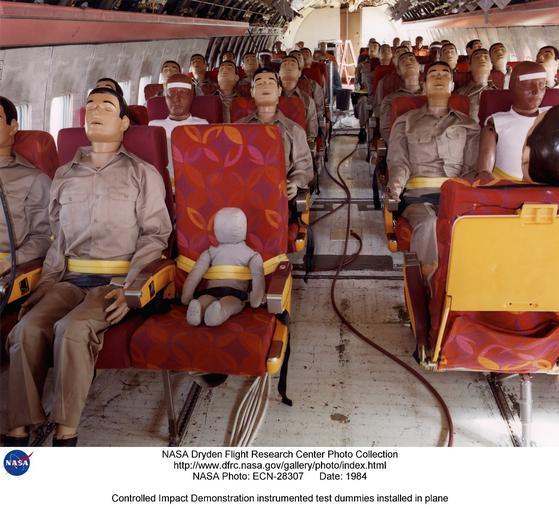| Keywords: Controlled Impact Demonstration instrumented test dummies installed in plane DVIDS681271.jpg en In this photograph are seen some of dummies in the passenger cabin of the B-720 aircraft NASA Langley Research Center instrumented a large portion of the aircraft and the dummies for loads in a crashworthiness research program In 1984 NASA Dryden Flight Research Facility and the Federal Aviation Adimistration FAA teamed-up in a unique flight experiment called the Controlled Impact Demonstration CID The test involved crashing a Boeing 720 aircraft with four JT3C-7 engines burning a mixture of standard fuel with an additive called Anti-misting Kerosene AMK designed to supress fire In a typical aircraft crash fuel spilled from ruptured fuel tanks forms a fine mist that can be ignited by a number of sources at the crash site In 1984 the NASA Dryden Flight Research Facility after 1994 a full-fledged Center again and the Federal Aviation Administration FAA teamed-up in a unique flight experiment called the Controlled Impact Demonstration CID to test crash a Boeing 720 aircraft using standard fuel with an additive designed to supress fire The additive FM-9 a high-molecular-weight long-chain polymer when blended with Jet-A fuel had demonstrated the capability to inhibit ignition and flame propagation of the released fuel in simulated crash tests This anti-misting kerosene AMK cannot be introduced directly into a gas turbine engine due to several possible problems such as clogging of filters The AMK must be restored to almost Jet-A before being introduced into the engine for burning This restoration is called degradation and was accomplished on the B-720 using a device called a degrader Each of the four Pratt Whitney JT3C-7 engines had a degrader built and installed by General Electric GE to break down and return the AMK to near Jet-A quality In addition to the AMK research the NASA Langley Research Center was involved in a structural loads measurement experiment which included having instrumented dummies filling the seats in the passenger compartment Before the final flight on December 1 1984 more than four years of effort passed trying to set-up final impact conditions considered survivable by the FAA During those years while 14 flights with crews were flown the following major efforts were underway NASA Dryden developed the remote piloting techniques necessary for the B-720 to fly as a drone aircraft; General Electric installed and tested four degraders one on each engine ; and the FAA refined AMK blending testing and fueling a full-size aircraft The 15 flights had 15 takeoffs 14 landings and a larger number of approaches to about 150 feet above the prepared crash site under remote control These flight were used to introduce AMK one step at a time into some of the fuel tanks and engines while monitoring the performance of the engines On the final flight No 15 with no crew all fuel tanks were filled with a total of 76 000 pounds of AMK and the remotely-piloted aircraft landed on Rogers Dry Lakebed in an area prepared with posts to test the effectiveness of the AMK in a controlled impact The CID which some wags called the Crash in the Desert was spectacular with a large fireball enveloping and burning the B-720 aircraft From the standpoint of AMK the test was a major set-back but for NASA Langley the data collected on crashworthiness was deemed successful and just as important NASA Identifier NIX-ECN-28307 2009-09-23 Glenn Research Center https //www dvidshub net/image/681271 681271 2012-10-10 10 16 WASHINGTON DC US PD-USGov Langley Research Center Images from DoD uploaded by Fæ Controlled Impact Demonstration |
