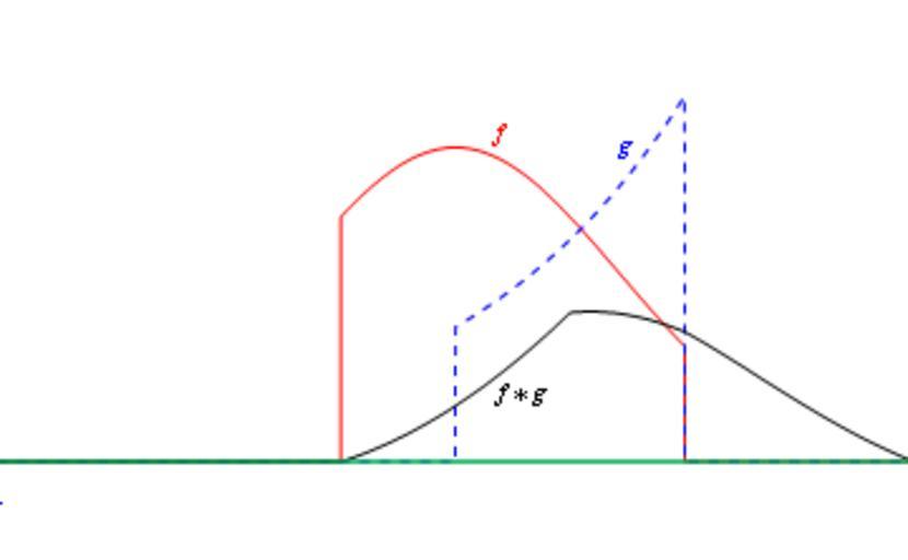 | Keywords: Convolution Animation (Exponential and Gaussian).gif en An animation of an f t an exponential function and g t a Gaussian function <math>f t \begin cases e -t 2 -0 5 \le t < 1 \\ 0 \mbox otherwise \end cases </math> <math>g t \begin cases 0 3 e t 0 \le t < 1 \\ 0 \mbox otherwise \end cases </math> where H x is the Heaviside step function Also shown is the time-reversed and shifted g ˆ’t in solid blue the product f t g ˆ’t green and the convolution h t f t ˆ— g t black equal to the area of the product at the particular own Inductiveload 2009-03-05 Mathematica Code <pre><nowiki> Function definitions ft_ Piecewise 0 t < -0 5 0 7 Exp-t 2 -0 5 < t < 1 0 t > 1 ; gt_ Piecewise 0 t < 0 0 3 Expt 0 < t < 1 0 t > 1 ; hy_ Module t Convolveft gt t y ; Parts of the drawing that only need to be computed once constplots Plot ft gt ht t -2 2 PlotStyle -> Red Blue Dashed Black ClippingStyle -> False Axes -> False Exclusions -> False ; anim TableShow The plots we generated earlier constplots Plot the time reversed gt g\Tau-t Plotg\Tau - t t -5 5 PlotPoints -> 100 ClippingStyle -> False PlotStyle -> Blue Exclusions -> False Axes -> False Plot the product of the ft and g\Tau-t Plotft g\Tau - t t -5 5 PlotPoints -> 100 ClippingStyle -> False Filling -> Axis FillingStyle -> DirectiveGreen Opacity0 2 PlotStyle -> Green Exclusions -> False Axes -> False Plot the embellishments Graphics Blue Line \Tau -0 05 \Tau 1 1 Red Textf 2 73 Background -> None Blue Textg 75 7 Background -> None Blue Text g \Tau-t \Tau - 58 4 Background -> None Green Text f t g \Tau-t \Tau - 0 55 -0 04 Background -> None Black TextStarf g 30 15 Background -> None Blue Text \Tau \Tau -0 1 Background -> White PlotRange -> -1 9 1 9 - 2 1 \Tau -2 2 025 Table index is the time delay ; ListAnimateanim </nowiki></pre> Convolution |