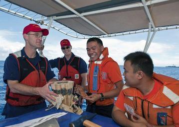 | Keywords: Cooperation Afloat Readiness and Training 2012 120707-N-HI414-045.jpg en U S Coast Guard Chief Machinery Technician James Sears assigned to the national security cutter USCGC Waesche WMSL 751 explains the use of a plugging kit to members of the Philippine Coast Guard and Navy aboard the Pacific Rose Explorer during a rescue and assistance training event This event is part of Cooperation Afloat Readiness and Training 2012 Philippines CARAT is a series of bilateral military exercises between the U S Navy and the armed forces of Bangladesh Brunei Cambodia Indonesia Malaysia the Philippines Singapore and Thailand Timor Leste joins the exercise for the first time in 2012 U S Navy photo by Petty Officer 3rd Class Gregory A Harden II 2012-07-07 Petty Officer 3rd Class Gregory Harden https //www dvidshub net/image/620443 120707-N-HI414-045 2012-07-09 08 53 CELEBES SEA PH PD-USGov-Military-Navy USCGC Waesche WMSL-751 Cooperation Afloat Readiness and Training 2012 Images from DoD uploaded by Fæ |