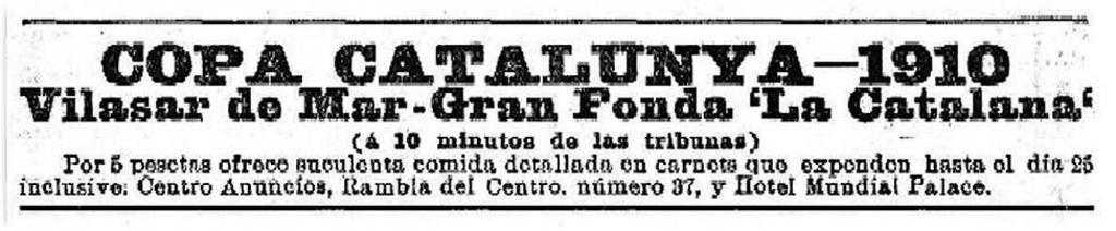 | Keywords: Copa-Catalunya-1910-Mundial-Palace-hotel-comida.jpg es Copa Catalunya “ 1910 - Vilasar de Mar “ Gran Fonda La Catalana La Vanguardia Barcelona 21-5-1910 pag 1 Copa Catalunya 1910-05-21 Copa Catalunya “ 1910 Vilasar de Mar “ Gran Fonda La Catalana à 10 minutos de las tribunas Por 5 pesetas ofrece suculenta comida detallada en carnets que expenden hasta el dia 25 inclusivo Centro Anuncios Rambla del Centro numero 37 y Hotel Mundial Palace PD-old ImageNote 1 11 27 953 153 975 202 2 Copa Catalunya “ 1910 Vilasar de Mar “ Gran Fonda La Catalana à 10 minutos de las tribunas Por 5 pesetas ofrece suculenta comida detallada en carnets que expenden hasta el dia 25 inclusivo Centro Anuncios Rambla del Centro numero 37 y Hotel Mundial Palace ImageNoteEnd 1 Copa Catalunya La Vanguardia advertisements 1910 Mundial Palace Hotel 1910 1910 advertisements in Spain |