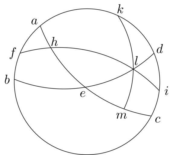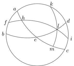 Keywords: Coppernicus 037.svg de à ber die Kreisbewegungen der Weltkörper 37 File Kreisbewegungen-Coppernicus-0 djvu p 80 1879 w Nicolaus Copernicus File Coppernicus_037 png PD-old-100 De revolutionibus drawings LaTeX Source Code <syntaxhighlight lang latex > complile with »pdflatex« \documentclasstikz convert pdf2svg standalone \usepackage tkz-euclide \usetkzobj all \begin document \begin tikzpicture \tkzSetUpLineline width 0 4pt \tkzDefPoint 130 2 A \tkzDefPoint 178 2 B \tkzDefPoint -28 2 C \tkzDefPoint 23 2 D \tkzDefPoint 0 0 E' \tkzDefPoint -0 05 -0 15 E \tkzDefPoint 157 2 F \tkzDefPoint -7 2 I \tkzDefPoint 65 2 K \begin pgfinterruptboundingbox \tkzCircumCenter A E C \tkzGetPoint O1 \tkzCircumCenter B E D \tkzGetPoint O2 \end pgfinterruptboundingbox \tkzDefPointByrotation center O1 angle 18 E \tkzGetPoint M \tkzDefPointByrotation center O2 angle 22 5 E \tkzGetPoint L \begin pgfinterruptboundingbox \tkzCircumCenter K L M \tkzGetPoint O3 \tkzCircumCenter F L I \tkzGetPoint O4 \tkzInterCC O1 A O4 I \tkzGetPoints H2 H \end pgfinterruptboundingbox \tkzDrawCircle E' A \tkzDrawArccolor black O1 A C \tkzDrawArccolor black O2 B D \tkzDrawArccolor black O3 M K \tkzDrawArccolor black O4 I F \draw A + 144 0 2 node a ; \draw B + 180 0 2 node b ; \draw C + -30 0 2 node c ; \draw D + 40 0 2 node d ; \draw E + -110 0 2 node e ; \draw F + 180 0 2 node f ; \draw H + 60 0 2 node h ; \draw I + 0 0 2 node i ; \draw K + 70 0 2 node k ; \draw L + 70 0 25 node l ; \draw M + -110 0 2 node m ; \end tikzpicture \end document </syntaxhighlight>