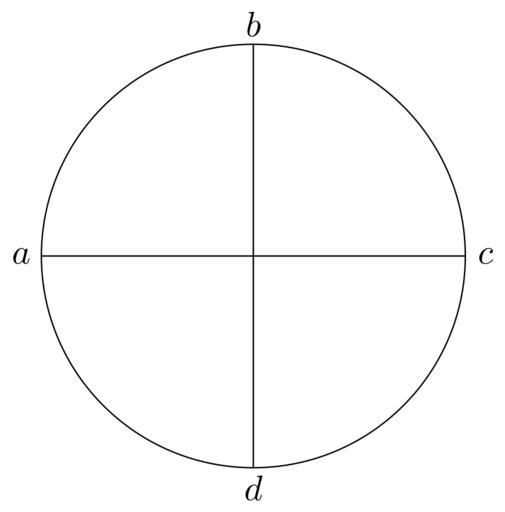 Keywords: Coppernicus 045.svg de à ber die Kreisbewegungen der Weltkörper 45 File Kreisbewegungen-Coppernicus-0 djvu p 141 1879 w Nicolaus Copernicus File Coppernicus_045 png PD-old-100 De revolutionibus drawings LaTeX Source Code <syntaxhighlight lang latex > complile with »pdflatex« \documentclasstikz convert pdf2svg standalone \begin document \begin tikzpicture \pgfmathsetmacro \radius 2 1 ; \draw 0 0 circleradius \radius; \coordinate A at 180 \radius ; \coordinate B at 90 \radius ; \coordinate C at 0 \radius ; \coordinate D at -90 \radius ; \draw A -- C ; \draw B -- D ; \draw A + 180 0 2 node a ; \draw B + 90 0 2 node b ; \draw C + 0 0 2 node c ; \draw D + -90 0 2 node d ; \end tikzpicture \end document </syntaxhighlight> |