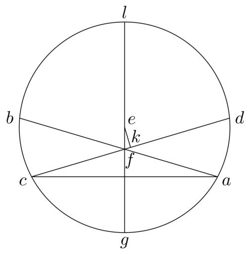 | Keywords: Coppernicus 058.svg de à ber die Kreisbewegungen der Weltkörper 58 File Kreisbewegungen-Coppernicus-0 djvu p 176 1879 w Nicolaus Copernicus File Coppernicus_058 png PD-old-100 De revolutionibus drawings LaTeX Source Code <syntaxhighlight lang latex > complile with »pdflatex« \documentclasstikz convert pdf2svg standalone \usetikzlibrary calc intersections \begin document \begin tikzpicture \pgfmathsetmacro \EG 2 1 ; \pgfmathsetmacro \GFA 62 ; \pgfmathsetmacro \GFB 95 ; \coordinate A at -90+\GFA \EG ; \coordinate B at -90-\GFB \EG ; \coordinate C at -90-\GFA \EG ; \coordinate D at -90+\GFB \EG ; \coordinate E at 0 0 ; \coordinate G at -90 \EG ; \coordinate K at C 5 D ; \coordinate L at 90 \EG ; \draw E circleradius \EG; \draw L -- G ; \draw C -- A ; \pathdraw name path lineCD C -- D ; \pathdraw name path lineBA B -- A ; \pathname intersections of lineCD and lineBA name sectionF ; \coordinate F at sectionF-1 ; \draw E -- K ; \draw A + -90+\GFA 0 2 node a ; \draw B + -90-\GFB 0 2 node b ; \draw C + -90-\GFA 0 2 node c ; \draw D + -90+\GFB 0 2 node d ; \draw E + 45 0 2 node e ; \draw F + -65 0 25 node f ; \draw G + -90 0 2 node g ; \draw K + 65 0 25 node k ; \draw L + 90 0 2 node l ; \end tikzpicture \end document </syntaxhighlight> |