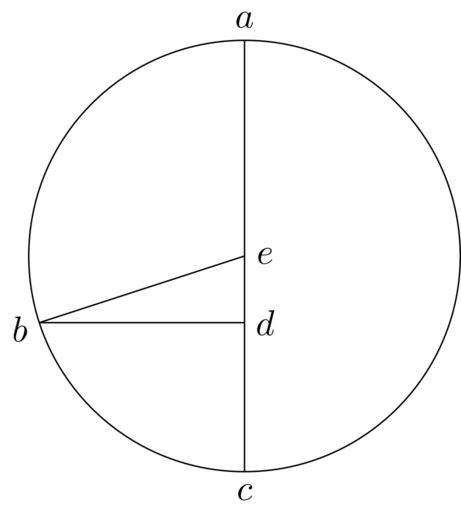 Keywords: Coppernicus 059.svg de à ber die Kreisbewegungen der Weltkörper 59 File Kreisbewegungen-Coppernicus-0 djvu p 177 1879 w Nicolaus Copernicus File Coppernicus_059 png PD-old-100 De revolutionibus drawings LaTeX Source Code <syntaxhighlight lang latex > complile with »pdflatex« \documentclasstikz convert pdf2svg standalone \begin document \begin tikzpicture \pgfmathsetmacro \EA 2 1 ; \coordinate A at 90 \EA ; \coordinate B at -162 \EA ; \coordinate C at -90 \EA ; \coordinate D at A -B ; \coordinate E at 0 0 ; \draw E circleradius \EA; \draw B -- E ; \draw C -- A ; \draw B -- D ; \draw A + 90 0 2 node a ; \draw B + -162 0 2 node b ; \draw C + -90 0 2 node c ; \draw D + 0 0 2 node d ; \draw E + 0 0 2 node e ; \end tikzpicture \end document </syntaxhighlight>