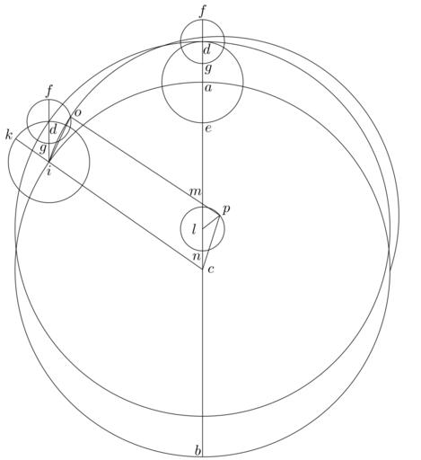 | Keywords: Coppernicus 064.svg de à ber die Kreisbewegungen der Weltkörper 64 File Kreisbewegungen-Coppernicus-0 djvu p 182 1879 w Nicolaus Copernicus File Coppernicus_064 png PD-old-100 De revolutionibus drawings LaTeX Source Code <syntaxhighlight lang latex > complile with »pdflatex« \documentclasstikz convert pdf2svg standalone \usepackage tkz-euclide \usetkzobj all \usetikzlibrary calc \begin document \begin tikzpicture \tkzSetUpLineline width 0 4pt \pgfmathsetmacro \CA 4 52 ; \pgfmathsetmacro \AD 0 98 ; \pgfmathsetmacro \DF 0 53 ; \pgfmathsetmacro \ACI 145 ; \pgfmathsetmacro \MLP 52 ; \tkzDefPoint 90 \CA A \tkzDefPoint -90 \CA B \tkzDefPoint 0 0 C \tkzDrawCircle C A \tkzDefPoint 90 \CA+\AD D \tkzDefPoint 90 \CA-\AD E \tkzDefPoint 90 \CA+\AD+\DF F \tkzDefPoint 90 \CA+\AD-\DF G \tkzDefPoint \ACI \CA I \tkzDefPoint \ACI \CA+\AD K \coordinate D2 at I + 90 \AD ; \coordinate F2 at D2 + 90 \DF ; \coordinate G2 at D2 + -90 \DF ; \tkzDefPoint 90 \AD L \tkzDefPoint 90 \AD+\DF M \tkzDefPoint 90 \AD-\DF N \coordinate P at L + 90-\MLP \DF ; \tkzInterCC D2 F2 P I \tkzGetPoints O O2 \tkzInterCC P I C A \tkzGetPoints X X2 \tkzDrawCircle A D \tkzDrawCircle D F \tkzDrawCircle I K \tkzDrawCircle D2 F2 \tkzDrawCircle L M \tkzDrawCircle L D \tkzDrawArccolor black P X I \draw F -- B ; \draw C -- K ; \draw F2 -- I ; \draw O -- P ; \draw O -- I ; \draw L -- P ; \draw C -- P ; \draw A + -45 0 2 node a ; \draw B + 125 0 2 node b ; \draw C + 0 0 2 node c ; \draw D + -60 0 2 node d ; \draw D2 + -60 0 2 node d ; \draw E + -45 0 2 node e ; \draw F + 90 0 2 node f ; \draw F2 + 90 0 2 node f ; \draw G + -45 0 2 node g ; \draw G2 + -135 0 2 node g ; \draw I + -90 0 2 node i ; \draw K + \ACI 0 2 node k ; \draw L + 180 0 2 node l ; \draw M + 115 0 4 node m ; \draw N + -135 0 2 node n ; \draw O + 80-\MLP 0 2 node o ; \draw P + 90-\MLP 0 2 node p ; \end tikzpicture \end document </syntaxhighlight> |
