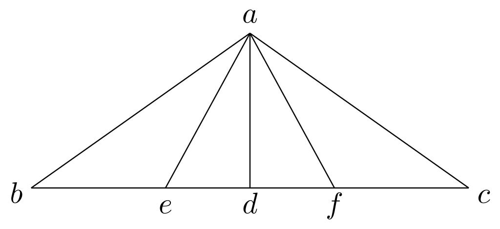 | Keywords: Coppernicus 088.svg de à ber die Kreisbewegungen der Weltkörper 88 File Kreisbewegungen-Coppernicus-0 djvu p 251 1879 w Nicolaus Copernicus File Coppernicus_088 png PD-old-100 De revolutionibus drawings LaTeX Source Code <syntaxhighlight lang latex > complile with »pdflatex« \documentclasstikz convert pdf2svg standalone \begin document \begin tikzpicture \pgfmathsetmacro \DB 2 59 ; \pgfmathsetmacro \DE 1 ; \coordinate A at 0 1 83 ; \coordinate B at -\DB 0 ; \coordinate C at \DB 0 ; \coordinate D at 0 0 ; \coordinate E at -\DE 0 ; \coordinate F at \DE 0 ; \draw A -- B ; \draw A -- C ; \draw A -- D ; \draw A -- E ; \draw A -- F ; \draw B -- C ; \draw A + 90 0 2 node a ; \draw B + -135 0 25 nodeanchor base b ; \draw C + -45 0 25 nodeanchor base c ; \draw D + -90 0 3 nodeanchor base d ; \draw E + -90 0 3 nodeanchor base e ; \draw F + -90 0 3 nodeanchor base f ; \end tikzpicture \end document </syntaxhighlight> |