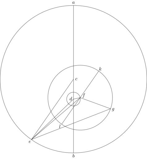 | Keywords: Coppernicus 114.svg de à ber die Kreisbewegungen der Weltkörper 114 File Kreisbewegungen-Coppernicus-0 djvu p 305 1879 w Nicolaus Copernicus File Coppernicus_114 png PD-old-100 De revolutionibus drawings LaTeX Source Code <syntaxhighlight lang latex > complile with »pdflatex« \documentclasstikz convert pdf2svg standalone \usepackage tkz-euclide \usetkzobj all \begin document \begin tikzpicture \tkzSetUpLineline width 0 4pt \pgfmathsetmacro \CA 5 3 ; \pgfmathsetmacro \CD 0 27 \CA ; \pgfmathsetmacro \DF 0 345 \CD ; \pgfmathsetmacro \FG 0 44 \CA ; \tkzDefPoint 90 \CA A \tkzDefPoint -90 \CA B \tkzDefPoint 0 0 C \tkzDefPoint -90 \CD D \tkzDefPoint -125 \CA E \coordinate F at D + 12 \DF ; \coordinate G at F + -20 \FG ; \begin pgfinterruptboundingbox \tkzDefLineparallel through F C E \tkzGetPoint F2 \tkzInterLC F F2 F G \tkzGetPoints K L \end pgfinterruptboundingbox \tkzDrawCircle C A \tkzDrawCircle D F \tkzDrawCircle F G \draw A -- B ; \draw C -- E ; \draw D -- E ; \draw D -- F ; \draw F -- E ; \draw F -- G ; \draw G -- E ; \draw K -- L ; \draw A + 90 0 2 node a ; \draw B + -90 0 2 node b ; \draw C + 0 0 2 node c ; \draw D + 170 0 2 node d ; \draw E + -125 0 2 node e ; \draw F + 30 0 3 node f ; \draw G + -20 0 2 node g ; \draw K + 55 0 2 node k ; \draw L + -130 0 2 node l ; \end tikzpicture \end document </syntaxhighlight> |