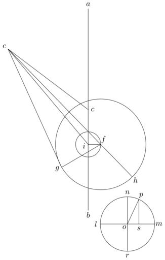 | Keywords: Coppernicus 122.svg de à ber die Kreisbewegungen der Weltkörper 122 File Kreisbewegungen-Coppernicus-0 djvu p 320 1879 w Nicolaus Copernicus File Coppernicus_122 png PD-old-100 De revolutionibus drawings LaTeX Source Code <syntaxhighlight lang latex > complile with »pdflatex« \documentclasstikz convert pdf2svg standalone \usepackage tkz-euclide \usetkzobj all \begin document \begin tikzpicture \tkzSetUpLineline width 0 4pt \pgfmathsetmacro \CA 4 53 ; \pgfmathsetmacro \OL 0 27 \CA ; \tkzDefPoint 90 \CA A \tkzDefPoint -90 \CA B \tkzDefPoint 0 0 C \tkzDefPoint 143 \CA E \tkzDefPoint -90 0 345 \CA I \coordinate F at I + 0 0 125 \CA ; \coordinate F2 at F + 0 0 45 \CA ; \tkzDefPoint -71 1 2 \CA O \coordinate L at O + 0 \OL ; \coordinate N at O + 90 \OL ; \coordinate P at O + 65 \OL ; \coordinate S at L- P ; \begin pgfinterruptboundingbox \tkzInterLC F E F F2 \tkzGetPoints H H2 \tkzDefPointByrotation center F angle -104 H \tkzGetPoint G \tkzInterLC O L O L \tkzGetPoints L M \tkzInterLC N O O L \tkzGetPoints N R \end pgfinterruptboundingbox \tkzDrawCircle I F \tkzDrawCircle F F2 \tkzDrawCircle O L \draw A -- B ; \draw C -- E ; \draw E -- H ; \draw E -- G ; \draw E -- I ; \draw F -- G ; \draw F -- I ; \draw L -- M ; \draw N -- R ; \draw O -- P ; \draw P -- S ; \draw A + 90 0 2 node a ; \draw B + -90 0 2 node b ; \draw C + 0 0 2 node c ; \draw E + 143 0 2 node e ; \draw F + 60 0 25 node f ; \draw G + -163 0 2 node g ; \draw H + -45 0 2 node h ; \draw I + -160 0 2 node i ; \draw L + 180 0 2 node l ; \draw M + 0 0 2 node m ; \draw N + 90 0 2 node n ; \draw O + -135 0 2 node o ; \draw P + 60 0 2 node p ; \draw R + -90 0 2 node r ; \draw S + -90 0 2 node s ; \end tikzpicture \end document </syntaxhighlight> |