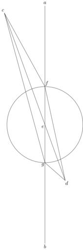 | Keywords: Coppernicus 130.svg de à ber die Kreisbewegungen der Weltkörper 130 File Kreisbewegungen-Coppernicus-0 djvu p 344 1879 w Nicolaus Copernicus File Coppernicus_130 png PD-old-100 De revolutionibus drawings LaTeX Source Code <syntaxhighlight lang latex > complile with »pdflatex« \documentclasstikz convert pdf2svg standalone \usepackage tkz-euclide \usetkzobj all \begin document \begin tikzpicture \tkzSetUpLineline width 0 4pt \pgfmathsetmacro \EA 8 ; \tkzDefPoint 90 \EA A \tkzDefPoint -90 \EA B \tkzDefPoint 110 \EA C \tkzDefPoint 0 0 E \tkzDefPoint 90 0 32 \EA F \coordinate D at C 1 5 E ; \begin pgfinterruptboundingbox \tkzInterLC A B E F \tkzGetPoints F G \end pgfinterruptboundingbox \tkzDrawCircle E F \draw A -- B ; \draw C -- D ; \draw C -- F ; \draw C -- G ; \draw F -- D ; \draw G -- D ; \draw A + 90 0 2 node a ; \draw B + -90 0 2 node b ; \draw C + 120 0 2 node c ; \draw D + -60 0 2 node d ; \draw E + -135 0 2 node e ; \draw F + 60 0 25 node f ; \draw G + -135 0 2 node g ; \end tikzpicture \end document </syntaxhighlight> |