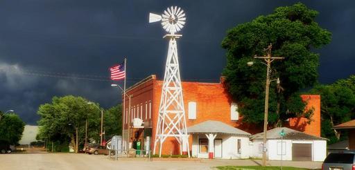 Keywords: cordova nebraska town urban windmill dark sky dark clouds stormy panorama flag outside street vehicles