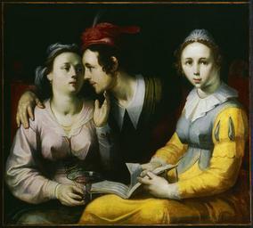 | Keywords: Cornelisz, Cornelis, A Courting Couple and Woman with a Songbook, ca. 1594.jpg Artwork Creator Cornelis van Haarlem Catalogue Entry Cornelis Cornelisz van Haarlem portrays a simple yet delicate temptation scene The gentleman is poised to embrace the drunken woman on the left We too are offered the lure of wine women and song as his companion ™s glass tips precariously forward The woman on the right turns to us a songbook in her lap Despite the moral Âdubiousness of the scene Cornelisz renders the balanced half-length figures in elegant curves Âsilhouetted against a mysteriously dark interior The painting bears witness to a change in the artist ™s style following the return of his fellow ÂHaarlem painter Hendrik Goltzius from Italy Cornelisz eschews the complexities of his earlier works in favor of a few large-scale figures set in a dark shallow space reminiscent of Caravaggio ™s innovations This painting ™s pastel tones and the figures ™ egg-shaped heads however are far from the realism of the Dutch followers of Caravaggio Cornelisz ™s simple elegant composition dignifies and refines a moralizing subject based on the wasted youth of the Prodigal Son Gallery Label Cornelis Cornelisz ™s painting shows a scene of temptation in which the attractions of music wine and love seduce his figures into indulgence in the pleasures of the senses Though the subject is explicitly secular the artist ™s treatment of the male figure in particular recalls contemporary artistic representations of the Prodigal Son suggesting that an everyday interaction might take on moral dimensions of biblical proportions The woman whom he courts presents another negative example as her distant expression and loose grip on the wine glass betray her intoxicated state As the couple boldly reciprocates romantic advances and sustains longing looks the woman with the songbook engages the viewer directly with her own gaze This motif might be taken to implicate the viewer as a participant in the merrymaking unsettling the usual borders between the actual world and the painted one ca 1594 Oil on canvas Size cm 85 7 95 3 <br> frame Size cm 107 9 117 2 12 4 Institution Princeton University Art Museum European Art object history exhibition history credit line Museum purchase partial gift of Mr H Kelley Rollings Class of 1948 and Mrs Rollings accession number 1997-102 place of creation Princeton University Art Museum PD-old-100 1638 cite book Steward James Christen Princeton University Art Museum Handbook of the Collections Revised and Expanded Edition 2013 Princeton University Art Museum Princeton NJ 978-0943012414 2nd 191 cite web A Courting Couple and Woman with a Songbook 1997-102 http //artmuseum princeton edu/collections/objects/8515 Princeton University Art Museum European art in the Princeton University Art Museum 1594 European paintings in the Princeton University Art Museum 1594 Paintings in the Princeton University Art Museum 1594 Dutch paintings in the Princeton University Art Museum 1594 Paintings by Cornelis Cornelisz van Haarlem Paintings of couples Uploaded with UploadWizard |