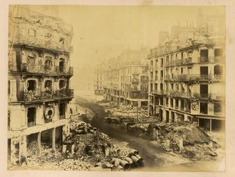 Keywords: Corner of the Rue Rivoli and Rue Saint-Martin WDL1324.png Artwork ru Б аквейе Б уно 1823 1875 гг fr Braquehais Bruno 1823-1875 en Braquehais Bruno 1823-1875 zh 布鲁诺·布拉奇海 ,1823-1875 年 pt Braquehais Bruno 1823-1875 ar براكهيه برونو، 1823-1875 es Braquehais Bruno 1823-1875 ru Угол улицы Риволи и улицы Сен- а тен fr Angle des rues de Rivoli et Saint-Martin en Corner of the Rue Rivoli and Rue Saint-Martin zh 里沃利街和 马丁街 角 pt Esquina de Rue de Rivoli e Rue Saint-Martin ar جانب من شارع ريفولي وشارع سان مارتن ru П ичиной ф анко-п усской войны стал ост нап яженности в отношениях между Ф анцией и П уссией в 1860-х гг Ф анция п и импе ато е аполеоне III была полна ешимости п ове ить астущую силу П уссии и отомстить за то что она ассмат ивала как яд дипломатических унижений П уссия п и канцле е Отто фон Бисма ке считала что война ге манских госуда ств п отив Ф анции под уководством П уссии станет ешающим шагом к созданию единой Ге манской импе ии Конфликт начался 19 июля 1870 г когда Ф анция объявила войну Ф анцузская а мия оказалась ужасно неподготовленной и поте пела сок ушительное по ажение в битве п и Седане отк ыв до огу на Па иж К 19 сентяб я немцкие войска полностью ок ужили го од и начали осаду кото ая п одлилась более четы ех месяцев От езанные от поставок п одовольствия из сельской местности па ижане пытались выжить питаясь собаками кошками и даже животными из па ижского зоопа ка Де евья на Елисейских полях и в па ках были вы ублены и использованы в качестве топлива 5 янва я немецкие войска начали бомба ди овку го ода кото ая п одолжалась по несколько часов каждую ночь в течение 23 суток а ок естности Па ижа было сб ошено около 12 000 сна ядов кото ые убили около 400 человек Па иж сдался 28 янва я в сущности положив конец войне За по ажением ф анцузов последовало на одное восстание и установление в а те 1871г Па ижской коммуны еволюционного п авительства сфо ми ованного в соответствии с ана хистскими и социалистическими п инципами Коммуна была жестоко подавлена в мае 1871 г ф анцузскими войсками п авительства Адольфа Тье а Во в емя неп одолжительного конт оля над Па ижем коммуна ы аз ушали импе ато скую колонну на Вандомской площади Подавление коммуны п ивело к дальнейшим значительным аз ушениям в го оде когда коммуна ы подожгли дво ец Тюиль и Лув и д угие здания К оме того многие здания пост адали или были аз ушены во в емя отчаянной пе ест елки между коммуна ами и конт еволюционными силами Siege de Paris 1870 1871 Осада Па ижа 1870 1871 гг п едставляет собой альбом из 110 фотог афий сделанных Огюстом Б уно Б аквейе 1823 1875 гг ф анцузским фотог афом и п ог ессивным фотожу налистом документи овавшим осаду и последствия бомба ди овок а также аз ушения п оизошедшие во в емя Па ижской коммуны <br>Ф анко-п усская война 1870 1871 гг ; Память ми а; Улица Риволи Па иж Ф анция ; Го одские сцены; Уще б нанесенный войной fr La guerre franco-allemande fut provoquée par l escalade des tensions entre la France et la Prusse dans les années 1860 La France sous l empereur Napoléon III était déterminée à contenir la croissance de la puissance prussienne et à venger ce qui était considéré comme une série d humiliations diplomatiques La Prusse sous le chancelier Otto von Bismarck considérait qu une guerre dirigée par la Prusse et menée par les États allemands contre la France serait un acte décisif menant à la création d un empire allemand unifié Le conflit débuta le 19 juillet 1870 jour où la France déclara la guerre L armée française s avéra terriblement mal préparée et subit une défaite désastreuse lors de la bataille de Sedan laissant la voie libre vers Paris Le 19 septembre les Allemands encerclèrent complètement la ville et commencèrent un siège qui allait durer plus de quatre mois Coupés du ravitaillement provenant de la campagne les Parisiens survécurent en mangeant les chiens les chats et même la plupart des animaux du zoo de Paris Les arbres des Champs-Élysées et des parcs furent coupés et brûlés pour servir de combustible Le 5 janvier les armé