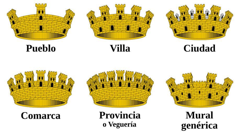 | Keywords: Coronas murales.svg Coronas murales Las cinco primeras están reguladas por la Generalitat de Cataluña de acuerdo a la http //www scgenealogia org/index htm SCGHSVN primero mediante el Decreto 263/1991 luego derogado y sustituido por el http //www gencat net/eadop/imatges/4914/07171155 pdf Decreto 139/2007 por el cual se regulan la denominación los símbolos y el registro de entes locales de Cataluña con fecha de publicación de 28 de junio de 2007 De acuerdo con la http //www scgenealogia org/heraldica/heraldcivic htm Introducción general de heráldica cívica las coronas murales pueden ser Veguería o diputación tiene un lienzo de muralla sin puertas y realzado de dieciseis torres almenadas se ven nueve unidas hasta la mitad de su altura por un muro sin almenas Comarca tiene un lienzo de muralla sin puertas y realzado por doce torres almenadas se ven siete unidas hasta la mitad de su altura por un muro sin almenas Ciudad tiene el mismo lienzo de muralla pero cerrado con diez puertas se ven cinco realzado por ocho torres se ven cinco unidas hasta la mitad de su altura por un muro sin almenas con una garita de plata en el medio de la parte superior Villa el lienzo de muralla va cerrado por ocho puertas se ven cuatro y también ocho torres cinco se ven unidas por un muro sin almenas y sin garitas Pueblo es como la de la villa pero solo con cuatro puertas y torres se ven tres de ambas La corona mural genérica está basada en ejemplares en las que no se especifica su tipo Muestra un lienzo de muralla cerrado por ocho puertas cuatro visibles y siete ventanas tres visibles realzado por ocho torres almenadas se ven cuatro unidas hasta la mitad de su altura por un muro almenado Own 2007-11-30 HansenBCN Image Spain Catalunya Heraldica Corones svg SVG coat of arms elements - mural crowns |