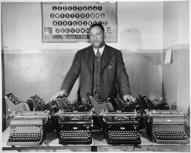 Keywords: "Cortez W. Peters, World's Champion Portable Typist, is shown with ten late model standard-size typewriters which he tur - NARA - 535804.jpg Scope and content General notes 535804 Local identifier 208-NP-1V-1 Office for Emergency Management Office of War Information Domestic Operations Branch News Bureau 06/13/1942 - 09/15/1945 Still Picture Records Section Special Media Archives Services Division NWCS-S National Archives at College Park 8601 Adelphi Road College Park MD 20740-6001 11/1942 Record group Record Group 208 Records of the Office of War Information 1926 - 1951 Record group ARC 535 Negro Activities in Industry Government and the Armed Forces compiled 1941 - 1945 Series ARC 535799 File unit File unit ARC Variant control numbers NAIL Control Number NWDNS-208-NP-1V-1<br /> Select List Identifier AFRO/AM LIST 246 Other versions <gallery> File Cortez_W _Peters _World's_Champion_Portable_Typist _is_shown_with_ten_late_model_standard-size_typewriters_which_he_tur_-_NARA_-_535804 tif tif File Cortez_W _Peters _World's_Champion_Portable_Typist _is_shown_with_ten_late_model_standard-size_typewriters_which_he_tur_-_NARA_-_535804 jpg jpg </gallery> NARA-cooperation PD-USGov QWERTY keyboard layouts Royal typewriters |