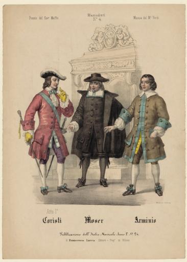| Keywords: Costumes for Act I of Giuseppe Verdi's I masnadieri.png Costumes for Act I of Giuseppe Verdi's en I masnadieri showing Coristi Chorister Moser and Arminio presumably from the original performance http //gallica bnf fr/ark /12148/btv1b8438469r Gallica; original source L'Italia Musicale Anno 1 n°24; edited Francesco Lucca Milano L'Italia Musicale started in 1847 and this is from its first year Anno 1 so 1847 or early 1848 Lit Corbetta presumably lithographed by Corbetta - this appears to be Francesco Corbetta 1815- Artist uncredited Restored by Adam Cuerden File Costumes for Act I of Giuseppe Verdi's I masnadieri jpg - Restoration JPEG File Costumes for Act I of Giuseppe Verdi's I masnadieri png - Restoration PNG File Costumes for Act I of Giuseppe Verdi's I masnadieri - Original png - Original PNG Since Corbetta was born in 1815 we can state with certainty this is PD-Old-70 I masnadieriAdam Cuerden's restorations |