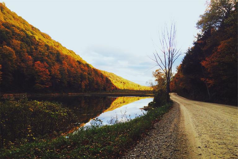 Keywords: country lane country road nature landscape rural lake calm river forest season dirt road water trees autumn colors sky hills