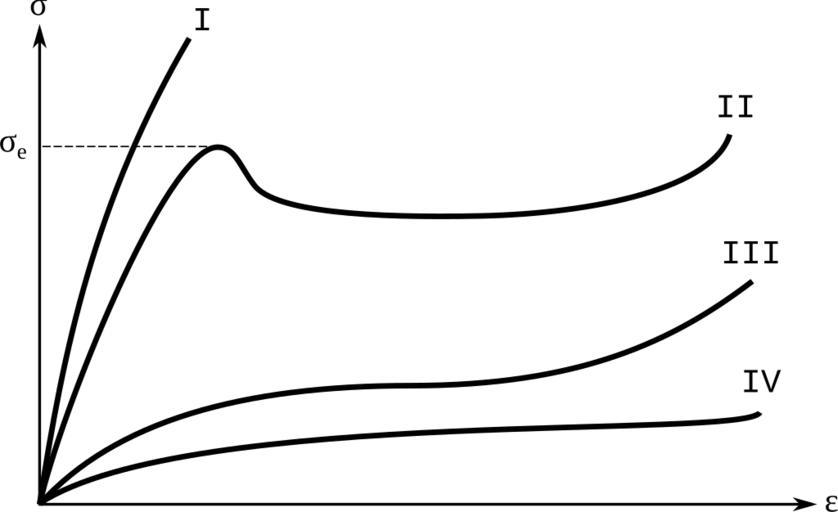 | Keywords: Courbe traction polymeres.svg en Tensile testing curves for polymers I brittle; II viscoelastic with flowing threshold <sub>e</sub>; III viscoleastic without threshold; IV viscoplastic fr COurbe de traction pour des polymères I fragile ; II viscoélastique avec seuil d'écoulement <sub>e</sub> ; III viscoélastique sans seuil d'écoulement ; IV viscoplastique own from J P Trotignon M Piperaud J Verdu A Dobraczynski Précis de matières plastiques ed Nathan/Afnor Paris 1993 p 29 Cdang 2011-05-09 courbe traction visco svg inkscape Cc-zero Stress-strain curves Polymer diagrams Plastic deformation |
