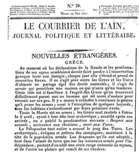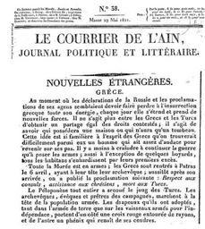| Keywords: Courier Ain 1821 Patra+title.JPG en News about the outbreak of the Greek Revolution in Patras 25 March/6 April 1821 el Η είδηση για την έκρηξη της Ε ανάστασης στην Πάτρα 25 αρτίου/6 Α ριλίου 1821 1821-05-29 Courrier de l' Ain newspaper 29 May 1821 p 4 http //www archives-numerisees ain fr/archives/resultats/journauxnumerises/n 100 RECH_nom 5B0 5D Courrier+de+l 27Ain type journauxnumerises anonymous other versions PD-old-70-1923 Uploaded with UploadWizard Greek Revolution 1821 Palaion Patron Germanos |