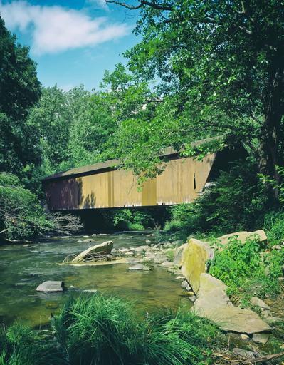 Keywords: covered bridge bridge old landmark historic stream creek water forest trees sky nature outside countryside rural stones summer maryland summertime