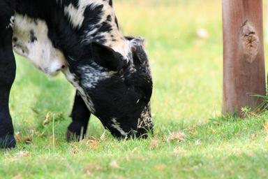Keywords: cow grazing bovine animal black and white grass meadow eating farm