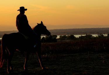 Keywords: cowboy sunset lake dusk country western silhouette man hat