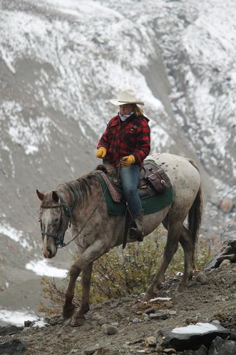 Keywords: cowgirl western canadian mountain riding horseback alberta snow downhill