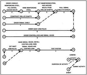 | Keywords: CPM Network Diagram.jpg en Example of CPM Network Diagram The critical path method CPM has proved a successful method for planning organizing and controlling projects Initially this management tool outlines the project graphically in the form of a network diagram This representation shown in Figure 12-3 illustrates The required operational sequence Which operations are concurrent and Which must be completed before others can be initiated CPM operations are referred to as activities In Figure 12-3 an example of the application of CPM to the installation of a traffic control system the activities necessary to complete the project are denoted by a line with an arrowhead The circled numbers represent events which mark the beginning or completion of an activity Dashed lines represent dummy activities which do not require any time but must be completed before another event can occur The number below the activity represents the amount of time required to complete the activity The critical path represents the project duration In the example the critical path is represented by the activities associated with events 1-11-15-19-23-27-29-31 In the example if activity 7-21 required a time of 10 instead of 8 then the critical path would become 7-21-23-27-29-31 because this sequence of activities would require a longer time In this case the receipt of mast arm poles would establish the critical path because they must be received before they can be set in place http //ops fhwa dot gov/publications/fhwahop06006/chapter_12 htm in Traffic Control Systems Handbook Chapter 12 Design and Implementation United States Department of Transportation - Federal Highway Administration Last modified January 23 2009 PD-USGov CPM diagrams |
