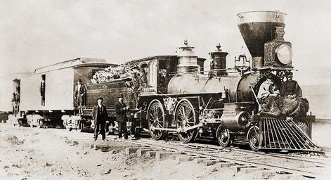 MAKE A MEME View Large Image Locomotive -113 FALCON 1869.jpg Central Pacific Railroad locomotive No 113 FALCON at Argenta Nevada March 1 1869 with UPRR engineer Jacob Blickensderfer left and CPRR engineer Lewis Metzler Clement right sitting on its pilot inspecting the ...