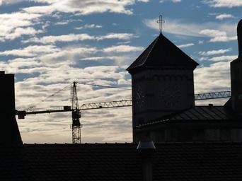 Keywords: crane baukran site build red white boom steeple church bell tower crane boom lattice boom crane sky construction work city city construction site ulm technology